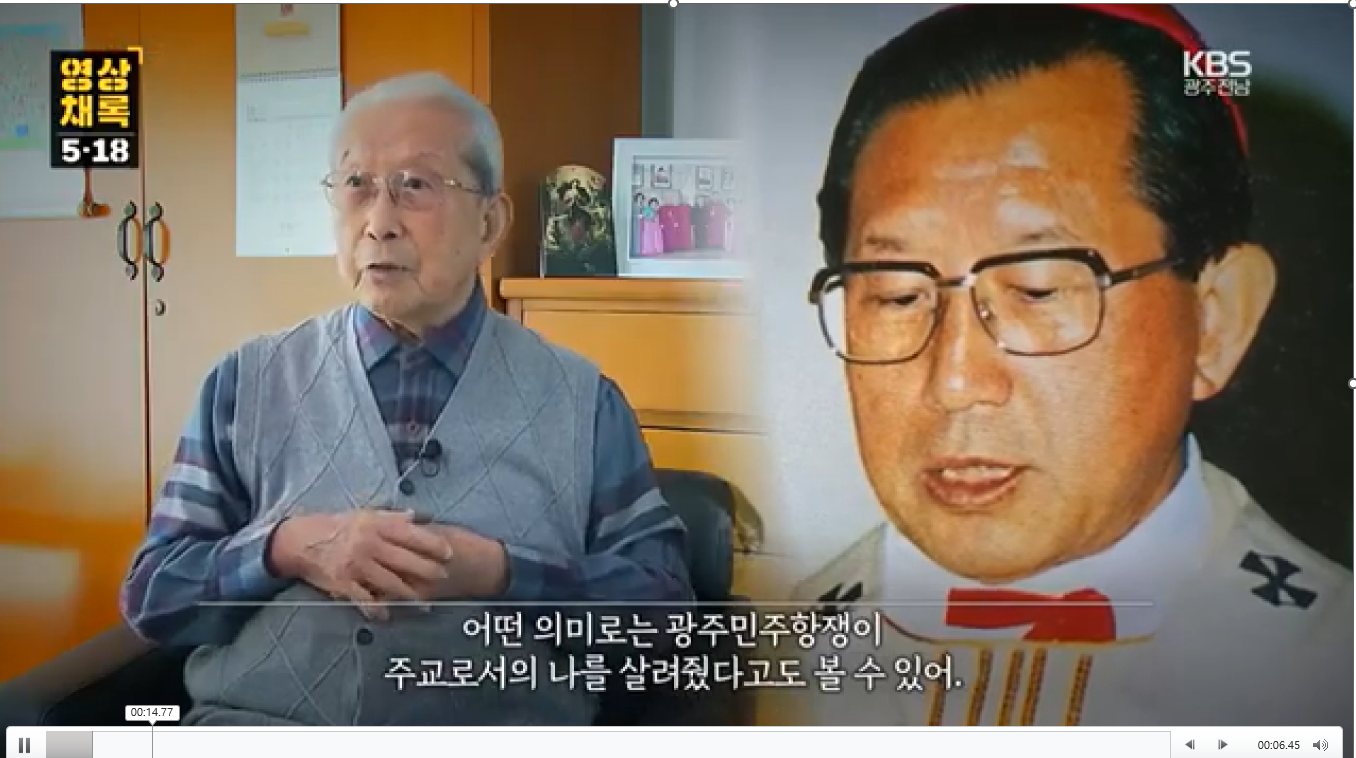 윤공희 대주교님께서 518 당시 가톨릭회관에서 계엄군의 폭력을 목격하고도 무서워서 내려가지 못했던 경험을 고백하며 그 후, 518 사형수 구명등 광주의 진실을 알려내기 위한 활동을 하셨던 기록영상과 1980년 6월 15일 인천교구 주보에 실렸던 호인수 신부님의 시 '기도'를 낭송하며 가톨릭 신앙인들의 역할에 대해 생각해 보는 시간도 가졌습니다.