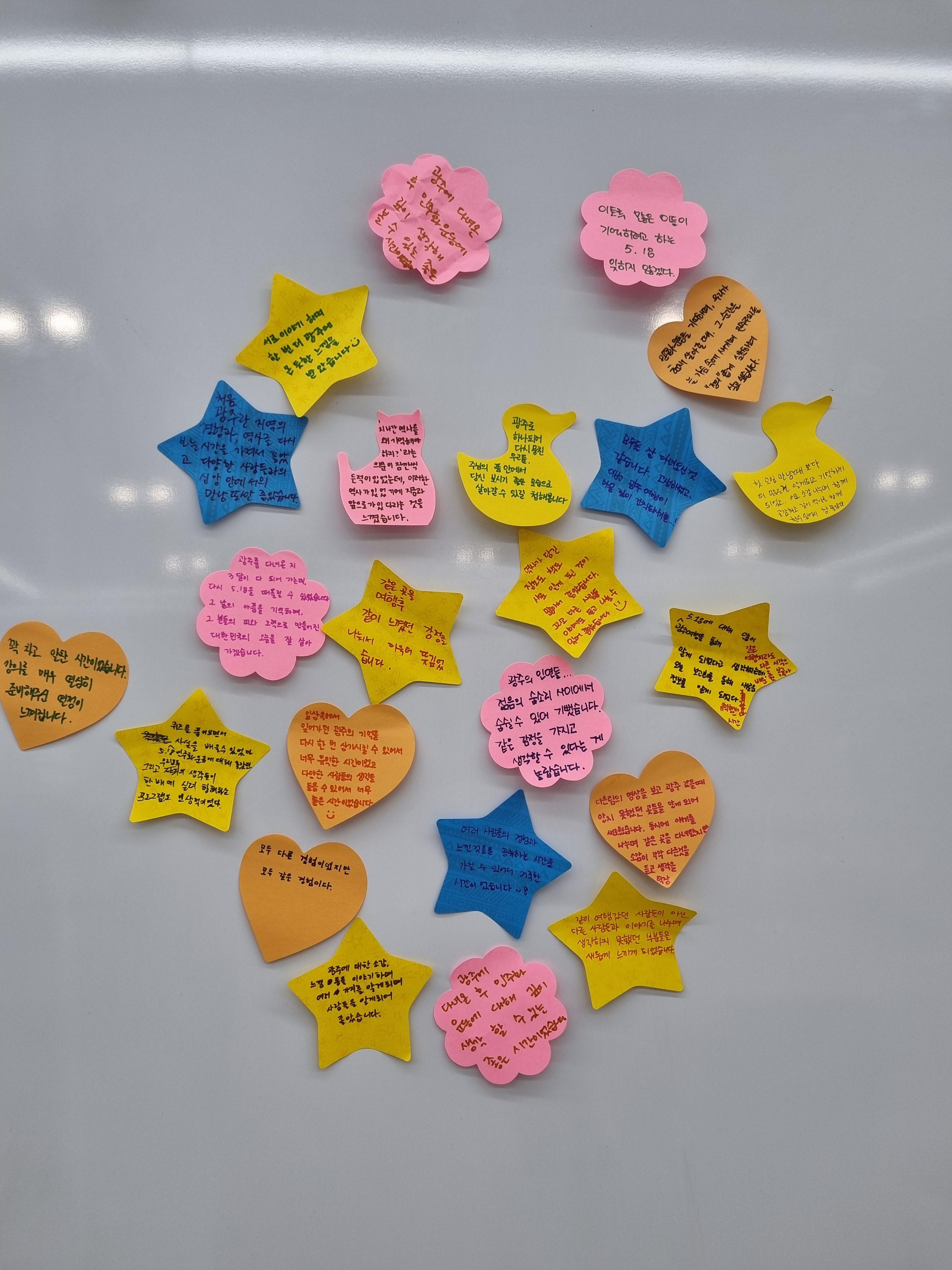 "광주여행을 통해 518에 대해 많이 알게 되었다고 생각했는데 오늘 보고회를 통해 새로운 정보를 알게되었다. 같은 여행지라도 다른 시각으로 보고 배운것 같아 유익했다." " 광주로 하나되어 다시뭉친 우리들, 주님의 품안ㅇ서 당신 보시기 좋은 모습으로 살아갈 수 있길 청해봅니다" "이토록 많은 이들이 기억하려고 하는 518 잊히지 않겠다" "광주에 다녀온 후 민주화운동에을 깊이 생각해 볼 수 있는 좋은 시간이었습니다" "퀴ㅡ를 풀어보며 518 민주화운동에 대해 몰랐던 사실을 배울 수 있었고, 우리 모두의 생각들이 한 배에 실려 항해하는 프로그램도 인상적이었다"